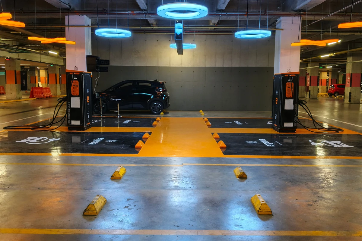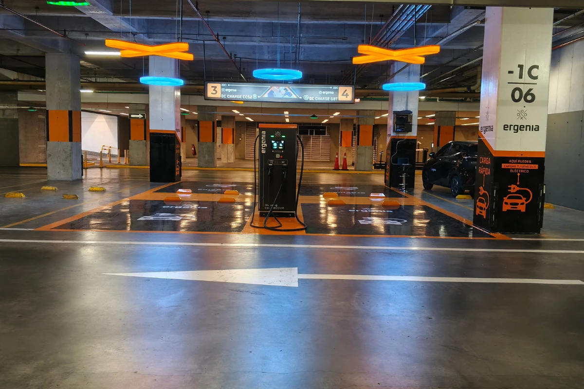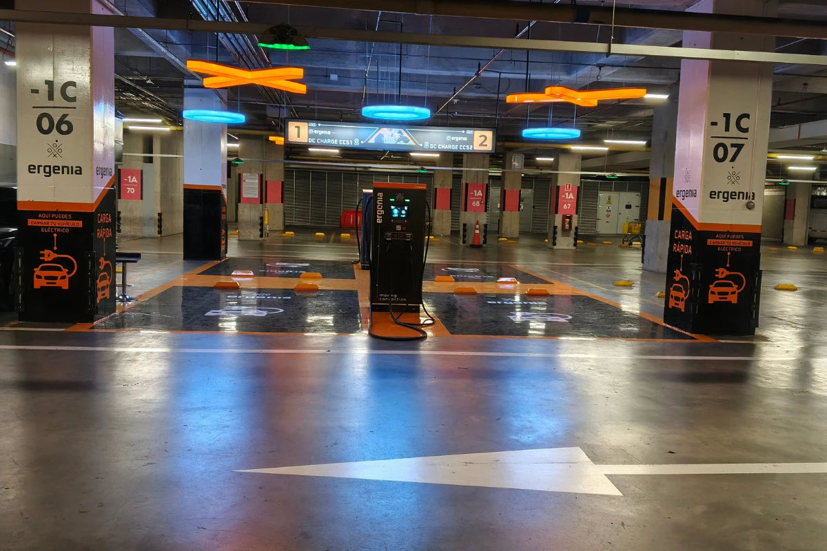 Carga tu vehículo eléctrico aquí. Encuentra el servicio de carga en el sótano N.º 1 – zona naranja. Disfruta una carga rápida y segura, con cobro por kWh, operada por ERGENIA.