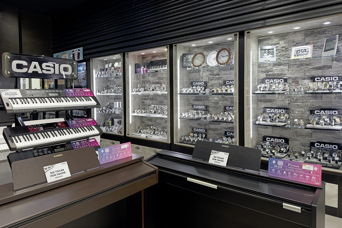 Venta de productos y servicios: relojes, calculadoras, pianos, teclados, y servicio de cambio de baterías.